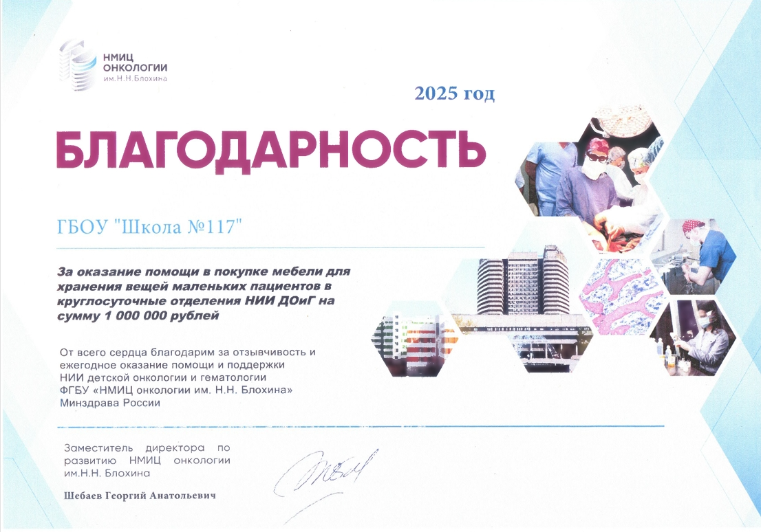 Администрация НМИЦ онкологии им. Н.Блохина, где размещен НИИ детской онкологии и гематологии, благодарит нашу школу «за оказание помощи в покупке мебели для хранения вещей маленьких пациентов в круглосуточные отделения НИИ ДОиГ на сумму 1 000 000 рублей».