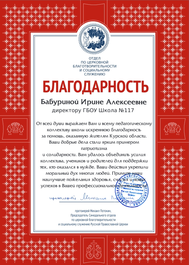 А за активное содействие и деятельную заботу о жителях Курской области, директор школы Ирина Алексеевна Бабурина получила заслуженную благодарность от Председателя Синодального отдела по церковной благотворительности и социальному служению Русской Православной Церкви, протоиерея Михаила Потокина.
